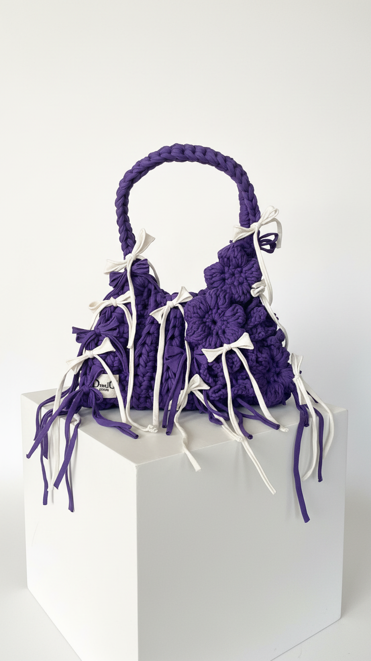 Lilac Chaos Handbag – ručne háčkovaná kabelka, ktorej dominantou sú veľké háčkované kvety zdobiace celý bok.